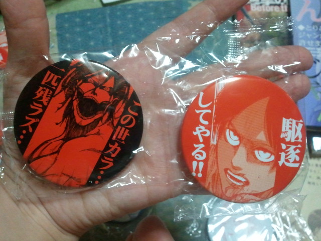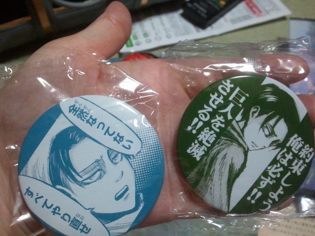 ↑ゲットした缶バッチ全部(うちジャンとクリスタは兵長二種と交換したもの)